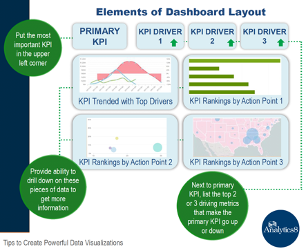 - Not everything needs to be viewable on the initial dashboard; incorporate the ability to provide more context with drill down and filter functionality as needed. This layout is a great starting point for creating a dashboard that guides users to insights.