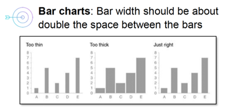 - Think about how you use graphs: what and how many you include, what each represents, as well as width and space between bars and lines.