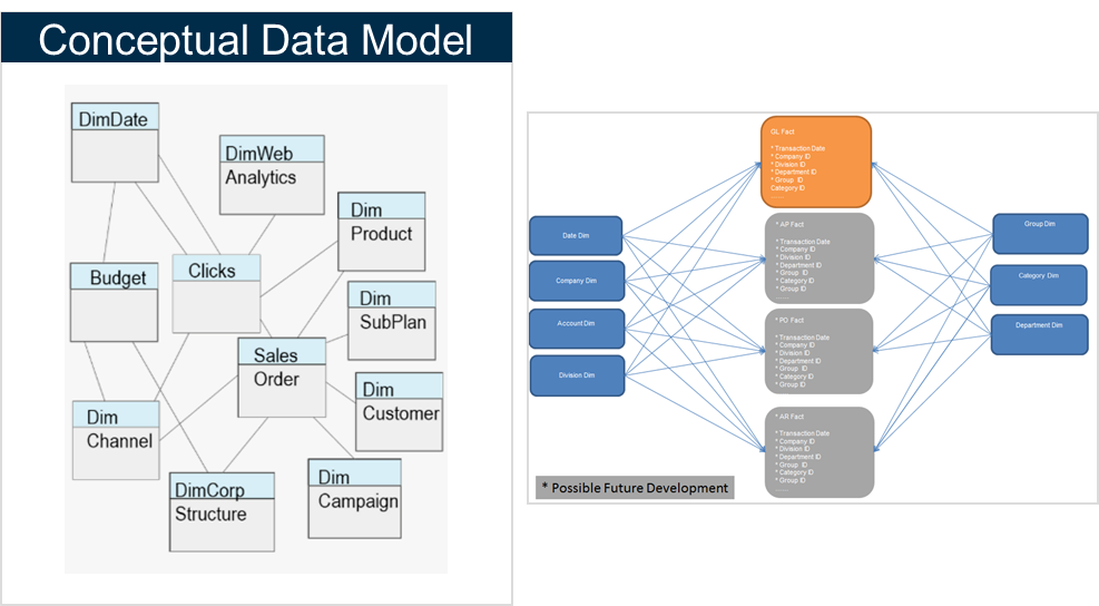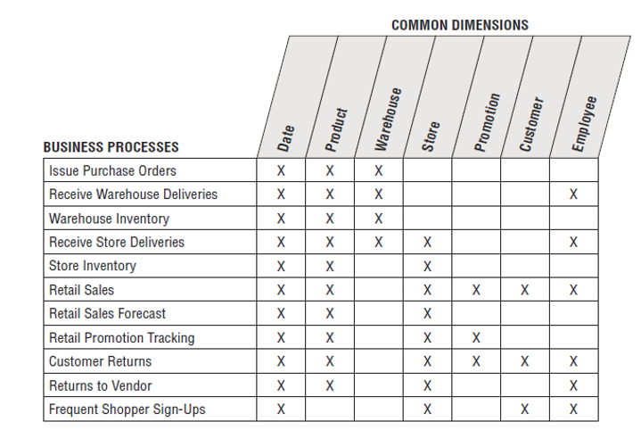 Use the Bus Matrix. The Bus Matrix contains all of the different core business processes that you’re trying to model along with the common dimensions which is how you will slice the data. It will provide a top-down strategic perspective to ensure data in the data warehouse environment can be integrated across the enterprise, while agile bottom-up delivery occurs by focusing on a single business process at a time.