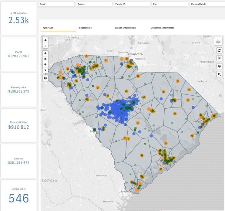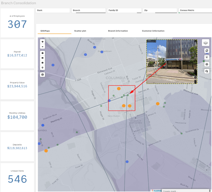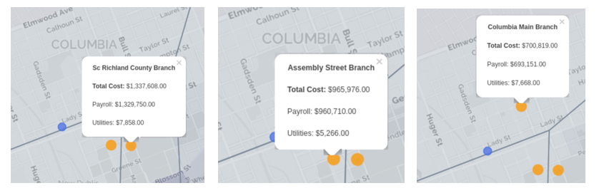 The pop ups can provide a lot of information for each branch with a single click. For this demo, we’re going to look at behavioral and utility costs for each branch. The following images tell us that the Richland County and Assembly Street branches have a significantly higher payroll and utilities expenses than the Columbia Main branch.