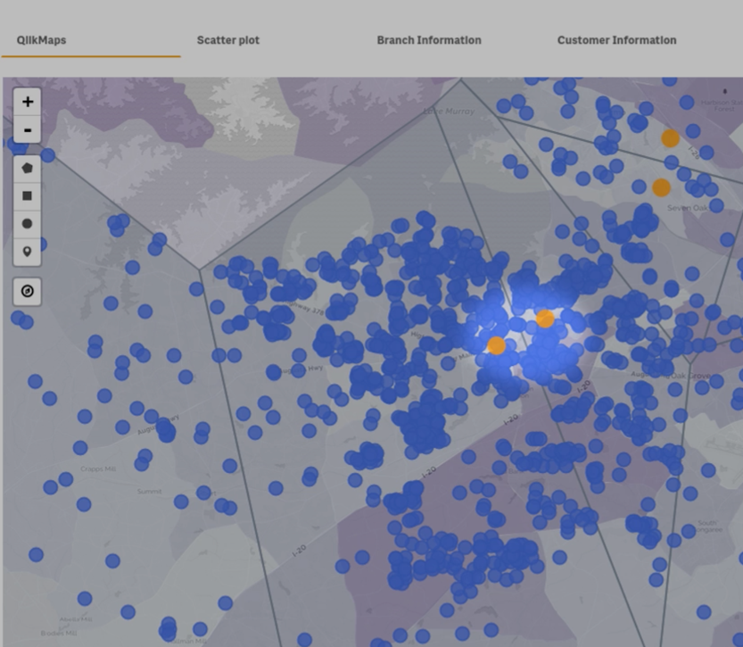 We can see that a heavy concentration of customers (in blue) centered around the two branch locations (in orange), showing that these branches service a relatively large number of customers.