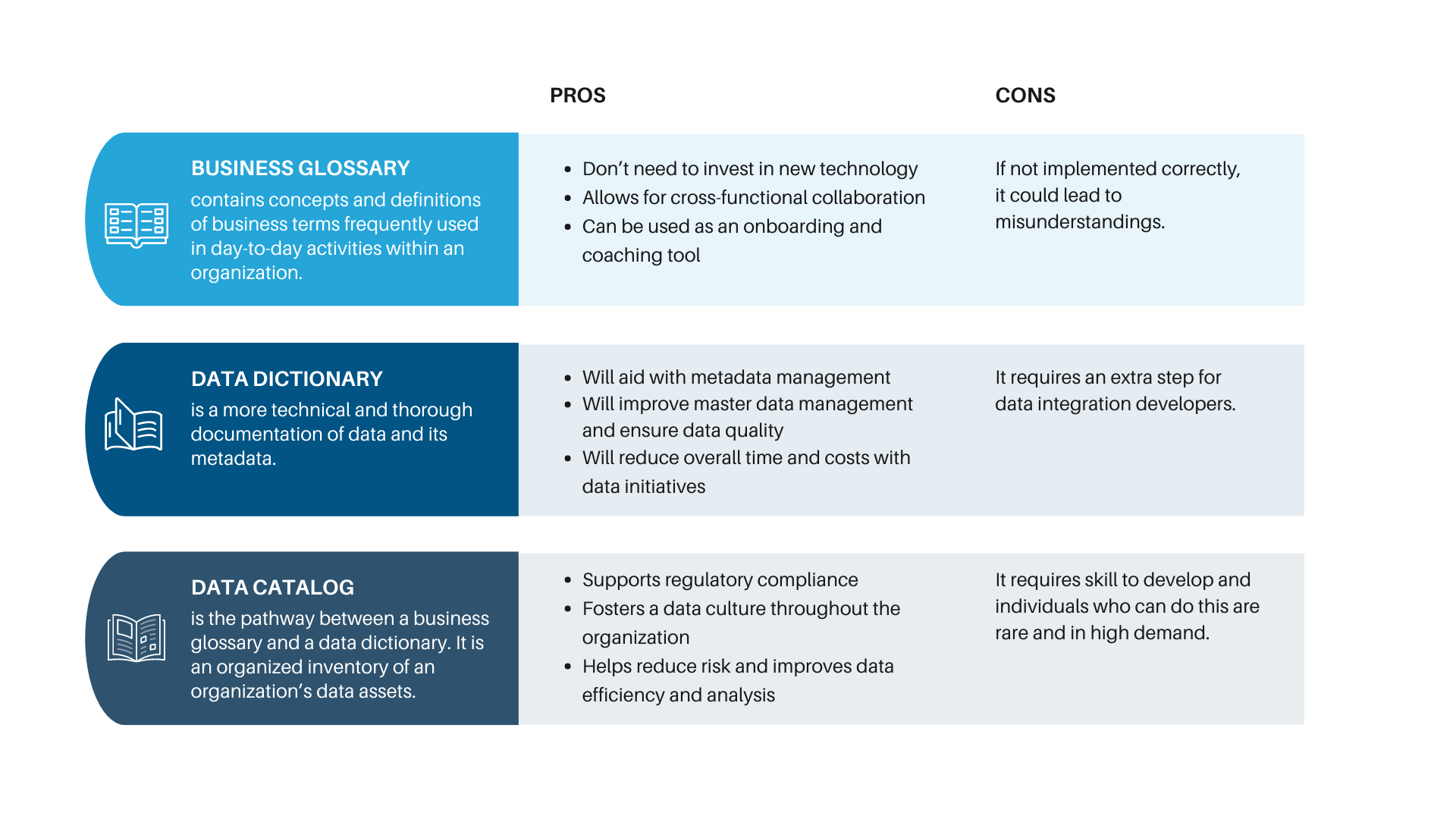 All three tools—business glossary, data dictionary, and data catalog—can help an organization better manage its data. Here’s a list of pros and cons for each.