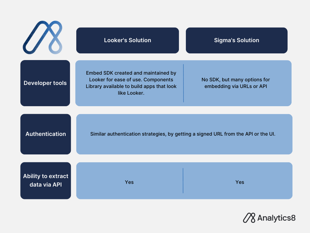 A direct comparison between Looker and Sigma in the realm of embedded analytics, underscoring their distinct developer tools and shared extraction capabilities.