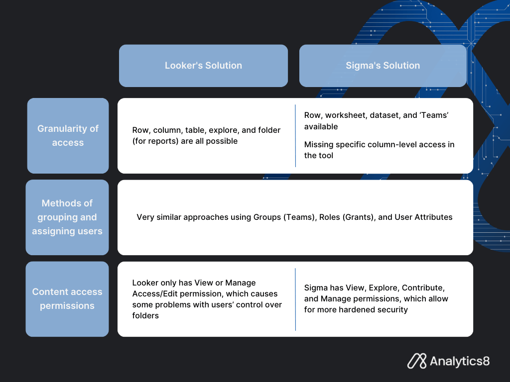 Contrasting Looker and Sigma’s security protocols, emphasizing differences in access granularity and the nuances of content permissions.