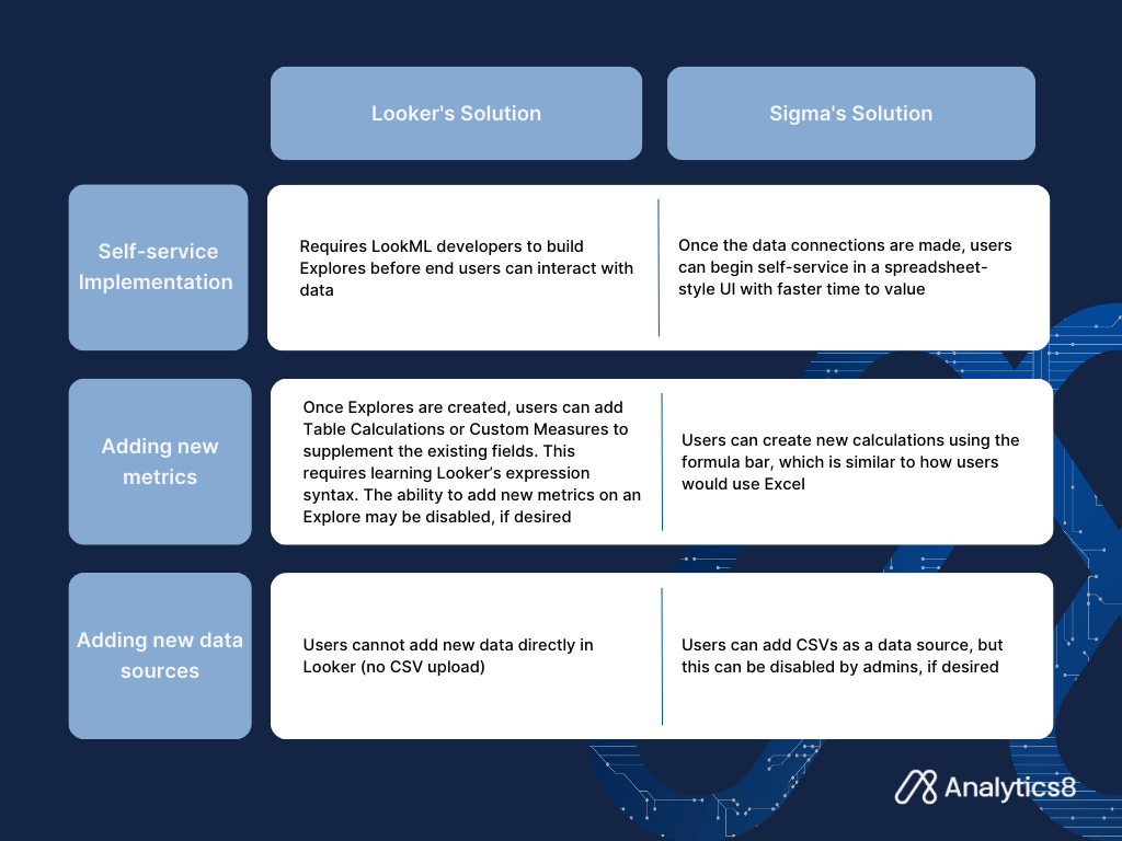 Side-by-side comparison of Looker and Sigma solutions, highlighting their approaches to self-service implementation, metric additions, and data source integrations.