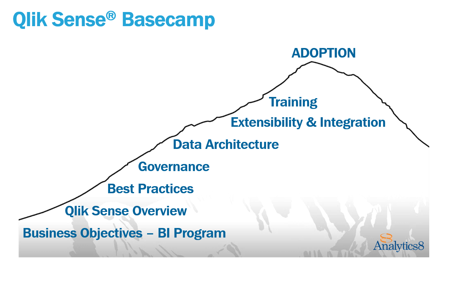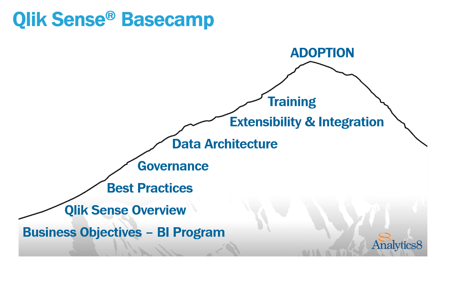 Think about climbing a mountain. Before you start climbing into higher elevations with less oxygen and colder temperatures, you must get acclimated. Climbers use a “basecamp” to do this. We also suggest our clients go through a basecamp process to build a base comfort level using Qlik across the enterprise. When moving from a departmental to enterprise implementation, you will have competing interests, because some aspects of the implementation are quicker to implement than others. One department may receive a high-value quick win that builds the foundation for future development, while another department must wait for something more complex like an executive dashboard which requires integration of many data sources. The Basecamp provides an opportunity to assess the business reasons behind using Qlik and to prioritize and organize each departments’ needs and projects.