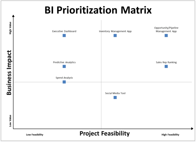 With our clients, we often use a tool called a BI Prioritization Matrix which helps them compile and prioritize key BI initiatives to determine the technical feasibility and real business value of each item and how they correlate with overarching corporate objectives.