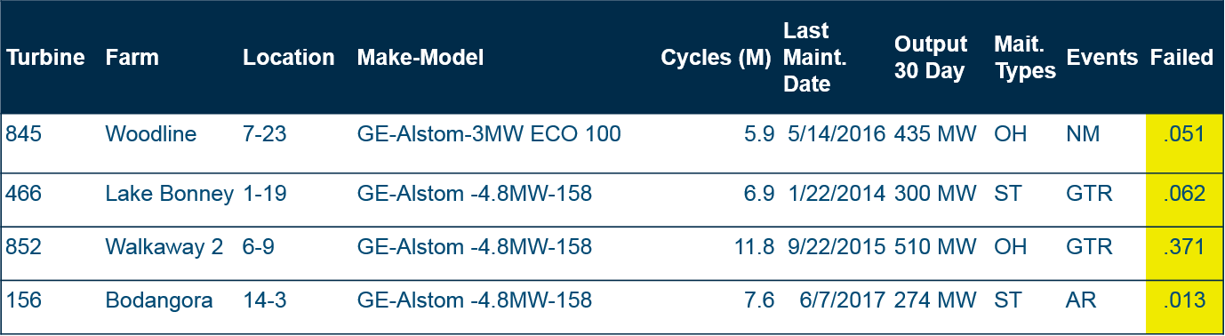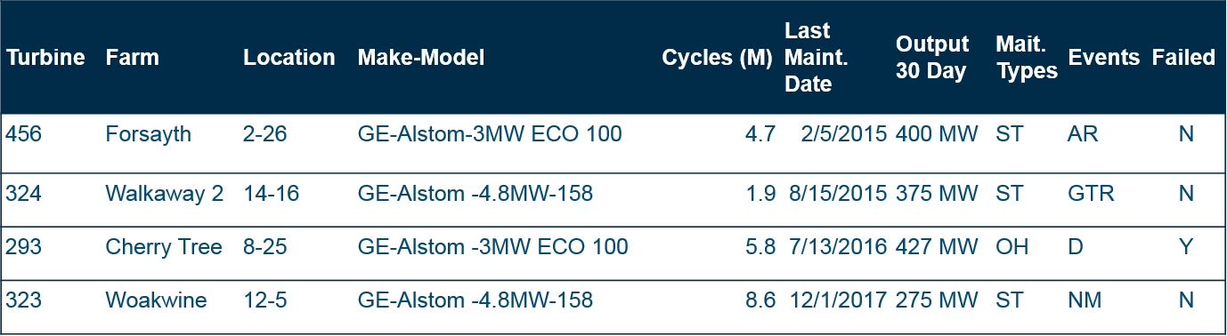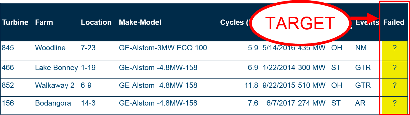 Now, lets take a look at a very similar data set – a prediction dataset – one where we don’t know if a turbine failed in our timeframe, because the time has not passed yet.