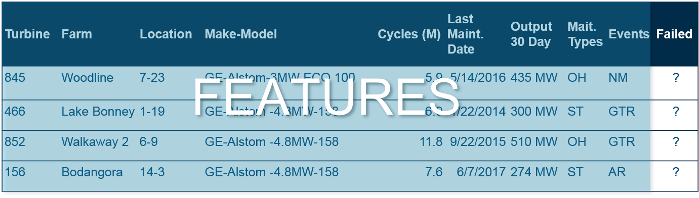 In this simplified sample data set, each row is an item (turbine) and each column is one Feature or attribute of the rows, including location, make-model, maintenance dates, operations data, and IoT data. The table below shows training or historical data where we know whether the turbine failed or not (within a particular timeframe).