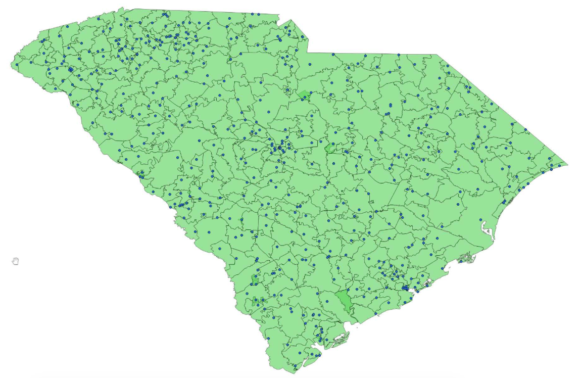 To solve this, we drew voronoi polygons around each of their store locations. A voronoi polygon is a set of the smallest set of contiguous polygons possible where all boundaries of the polygon are equadistant from the next point (in this example, the store location/blue dot). Thus, the voronoi polygon represents the smallest possible localized market based on store location.