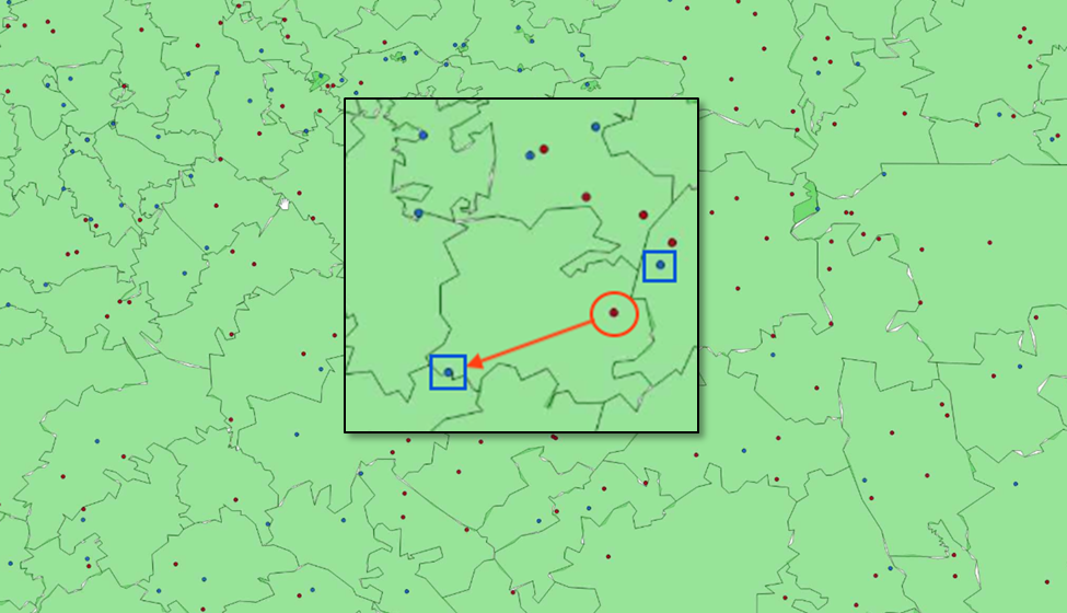 If Grouped By Postcode, The Customer (Red Dot) Would Be Assigned To A Store Location (Blue Dot) Unnecessarily Far Away