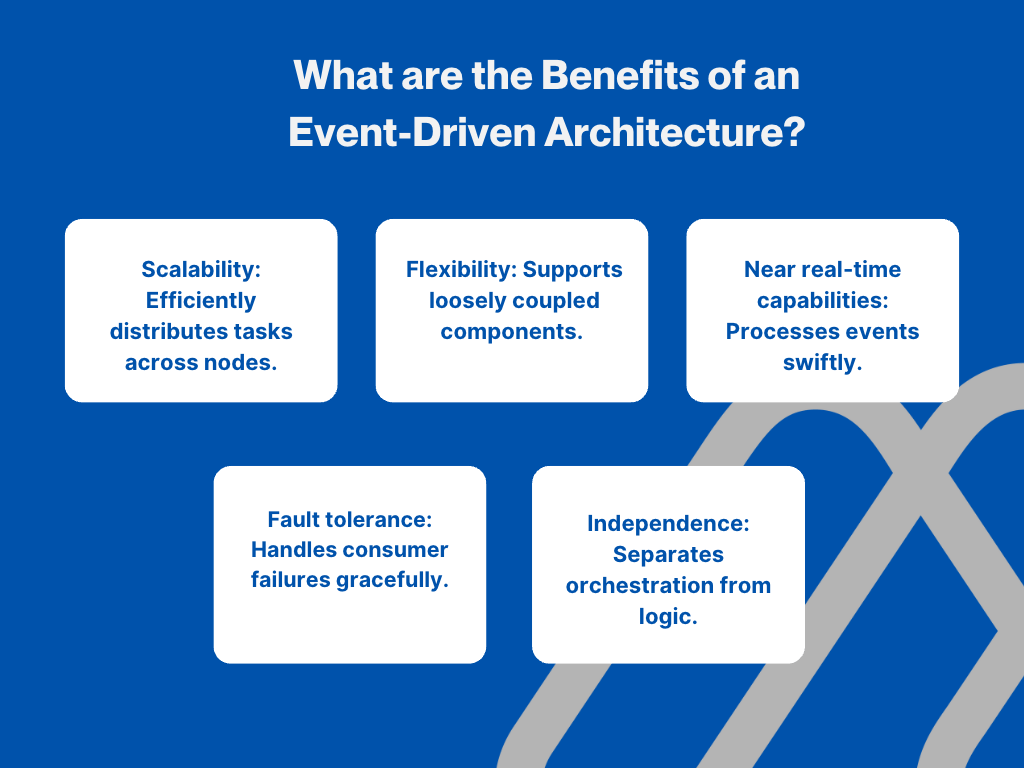 An event-driven architecture provides numerous general benefits to businesses, including scalability, flexibility, near real-time capabilities, fault tolerance, and independence of application orchestration from application logic.