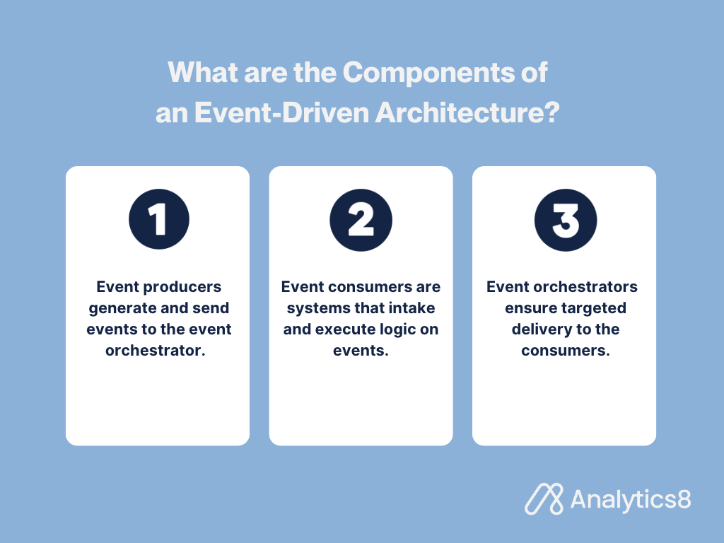 An event-driven architecture has three components: event producers, event consumers, and event orchestrators.
