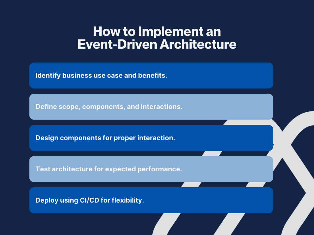 To implement an event-driven architecture, you need to identify the business use case, define the scope and requirements, design the necessary components, test to ensure it works as expected, and deploy using a CI/CD pipeline.