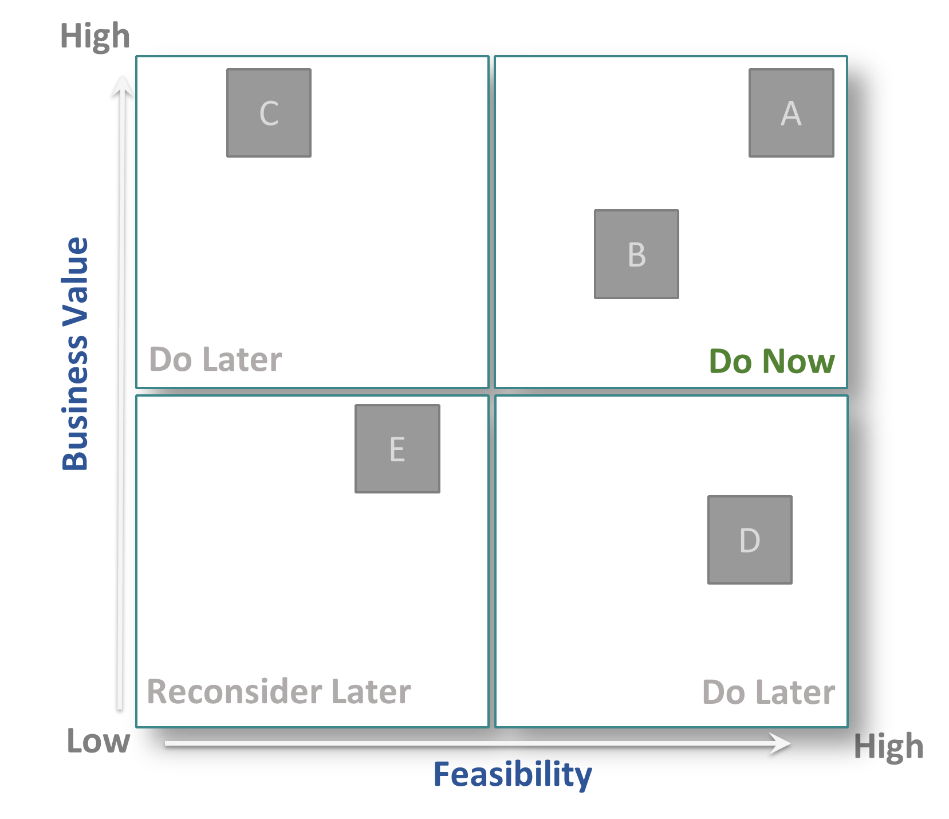 3.) Evaluate the assessment and create a prioritization matrix. Once you’ve identified issues, you have action items that need to be prioritized. Prioritize those items by considering Business Value on one dimension and Feasibility of Remediation on the other. The items can then be categorized as high feasibility-high value, low feasibility-high value, low feasibility-low value, and high feasibility-low value.