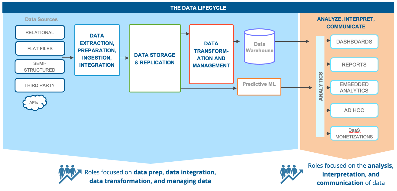 - Data Engineer/Data Integration Specialist: Responsible for designing and developing data infrastructure to ensure broad availability of data throughout an organization, as well as for implementing systems to integrate (replicate, extract, transform, load) data assets in batch or near-real-time. This function is designed to build systems for collecting, storing, and analyzing data at scale. The data engineer (or ETL developer) works with the business analysts on the source to target mappings to populate a data warehouse and then write the code to transform the data and load it into the target data model. Centralizing data integration and preparation and having a dedicated role for it means data analysts and business users can focus on analyzing data and using insights rather than spending large chunks of time manually combining data sources repeatedly, redundantly, and sometimes inaccurately.