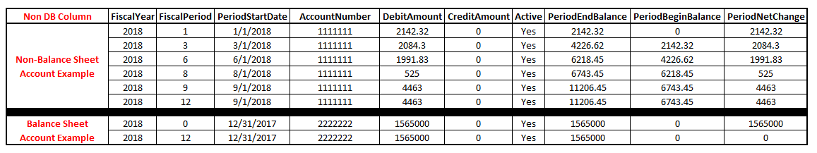 When attempting to write a SQL view to perform the aggregations, the first issue I ran into was that not all ending balances for accounts are calculated the same. For example, all income statement accounts are to be calculated starting at $0.00 on the first day of the fiscal year; whereas balance sheet accounts have rolling balances from year to year. To further complicate our scenario, account specific information, which is normally available in the Dynamics GP table, was not in their system—it was provided to us as a separate flat file. In this scenario, the relevant account information (balance sheet and non-balance sheet) was included in the AccountType column within the separate flat file.