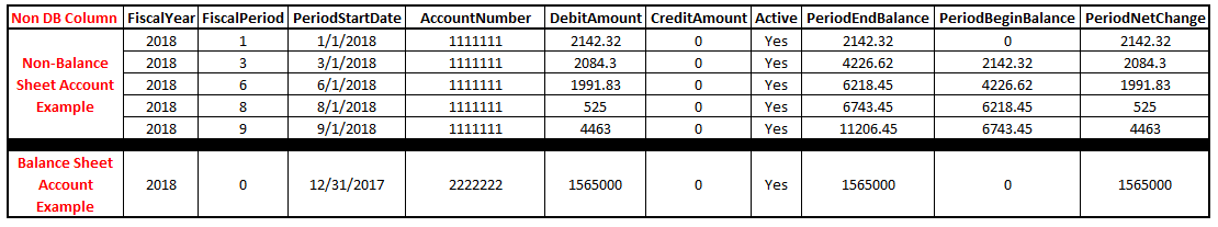It’s a hefty query, but once executed, the resulting view provides me with all the columns I want. Here’s an example output for a non-balance sheet and balance sheet account: