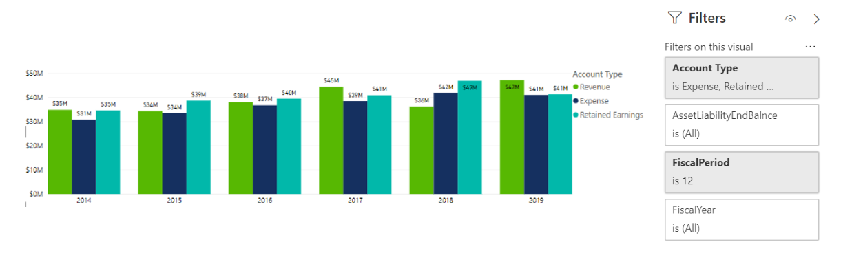 From this view, we’re ready to load the table into our BI dashboard. Once loaded, we set the filter to Period 12, and the summary total for all accounts (balance sheet and income statement) are accurately presented. In the below example, you can clearly see revenue, expense, and retained earning account types, and the values are all positive.