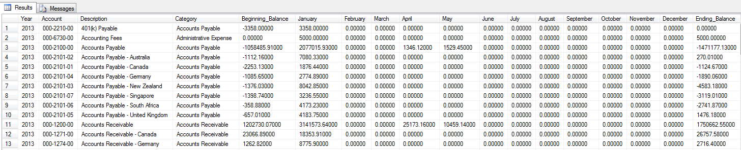 I started with this resource to first create a GL account summary table that includes the Dynamics GP datasets I wanted in my table: the beginning balance, ending balance, and net change throughout the months.