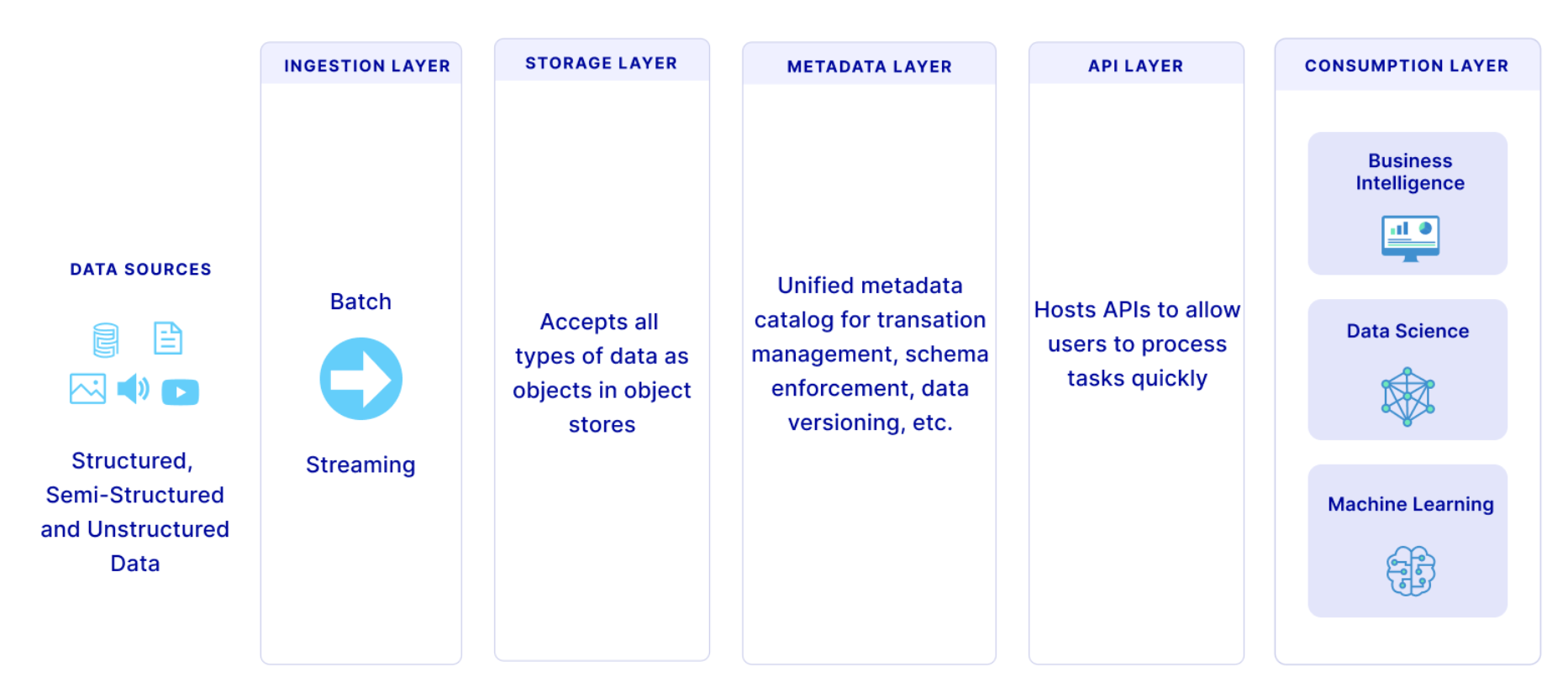 The data lakehouse architecture consists of five distinct layers, including ingestion, storage, metadata, API, and consumption layers. Each play a key role in making the data lakehouse a modern data architecture. Image credit: Striim